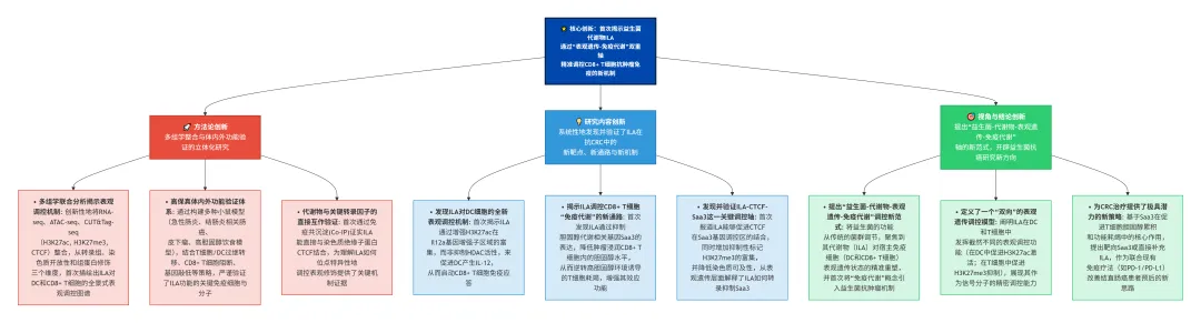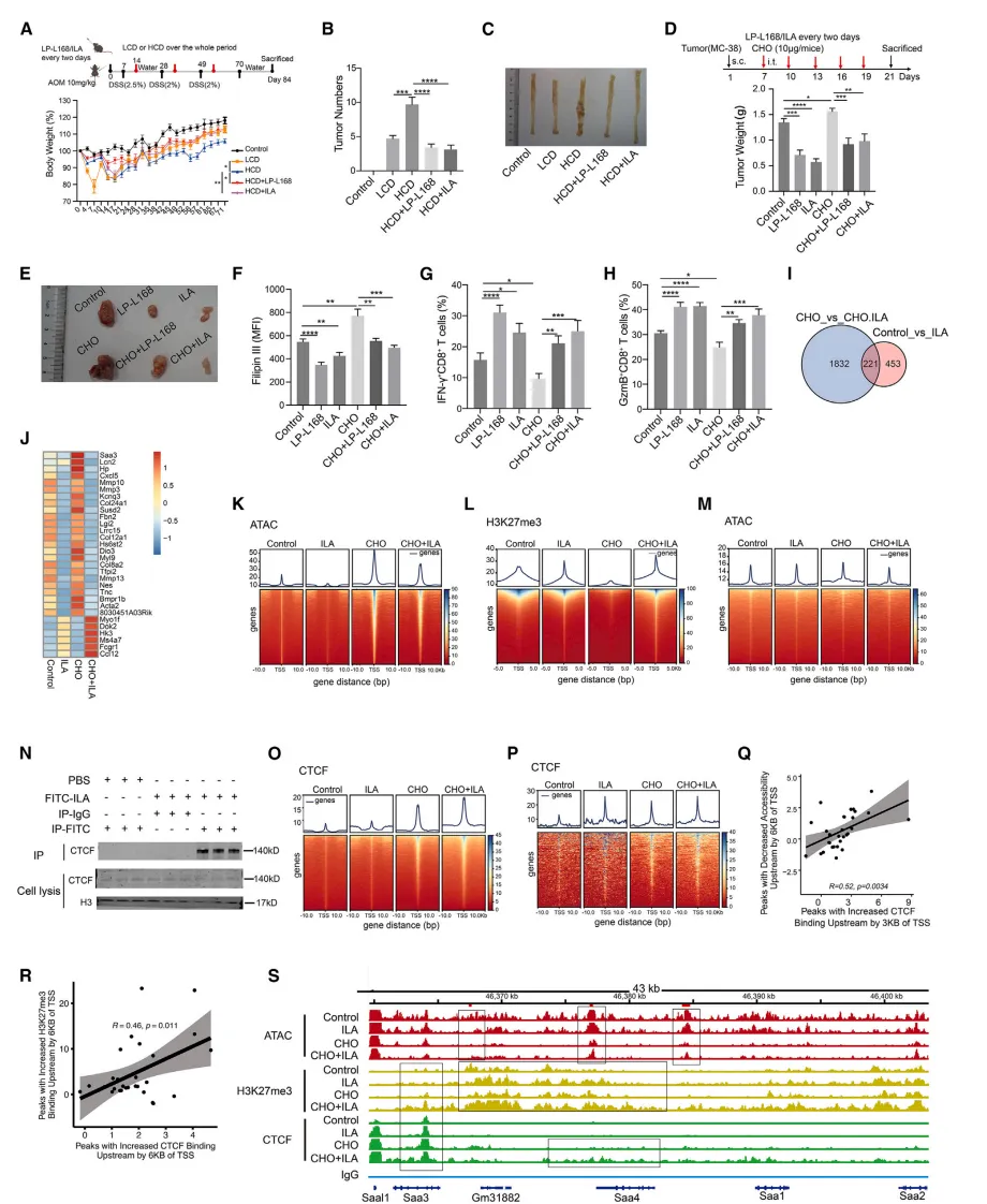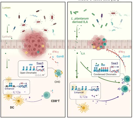 ILA通过两种表观遗传机制增强CD8⁺ T细胞抗肿瘤免疫:促进树突状细胞产生IL-12,并抑制CD8⁺ T细胞中Saa3表达以降低其胆固醇水平,为结直肠癌的益生菌治疗提供了新靶点。