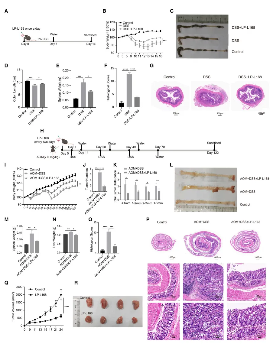 研究首先验证了植物乳杆菌L168(LP-L168)对肠道病变的改善作用。在急性结肠炎模型中,LP-L168处理显著缓解了小鼠体重下降、结肠缩短等症状【图1A-1G】。