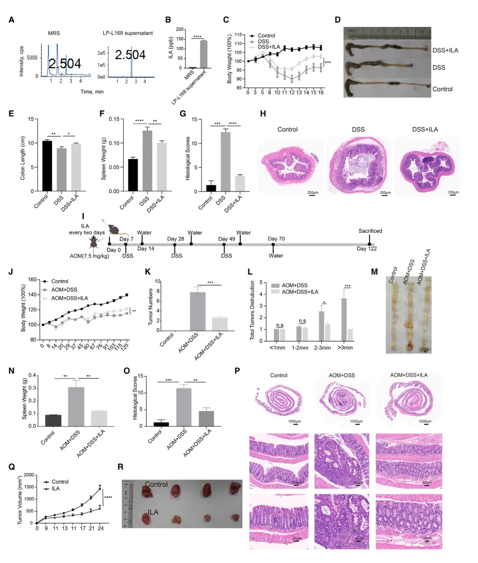 在AOM/DSS诱导的结直肠癌模型中,LP-L168及其代谢物吲哚-3-乳酸(ILA)均展现出抗肿瘤效果,处理组肿瘤数量和负荷显著减少【图1H-1P,图2I-2P】。