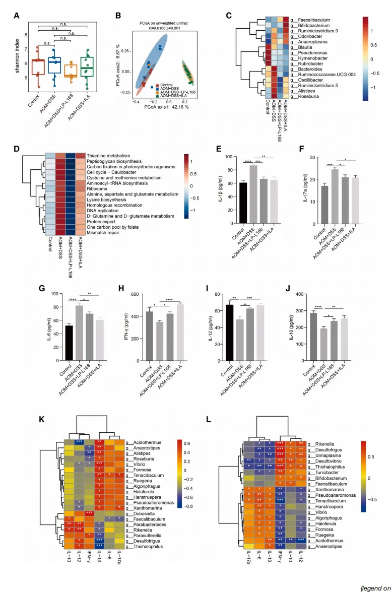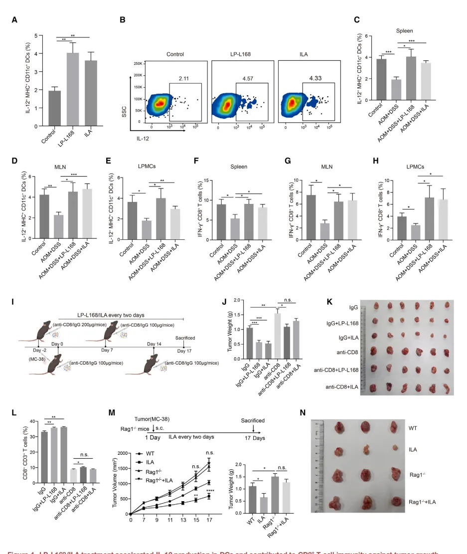 伴随菌群变化,促炎因子水平下降,而抗肿瘤免疫相关因子(IL-12、IFN-γ)水平显著升高【图3E-3J】。这提示LP-L168/ILA可能通过优化肠道微生态来重塑抗肿瘤免疫环境。