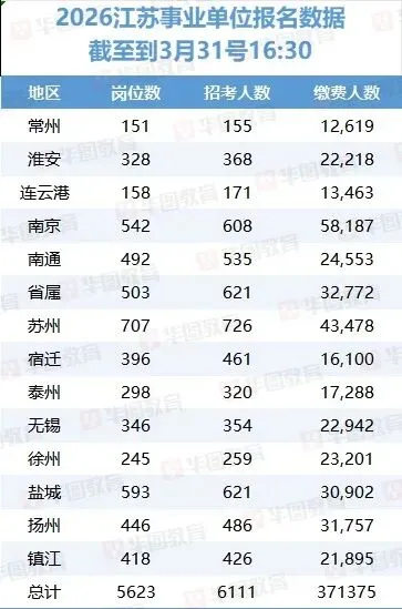 📢2026江苏事业单位报名已结束,部分地市缴费还未截止,还未完成缴费的考生请抓紧时间!截至3月31日16:30,全省缴费总人数已突破37.1万,最新报名数据新鲜出炉!