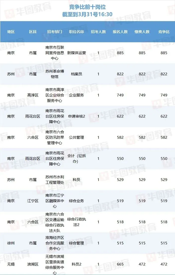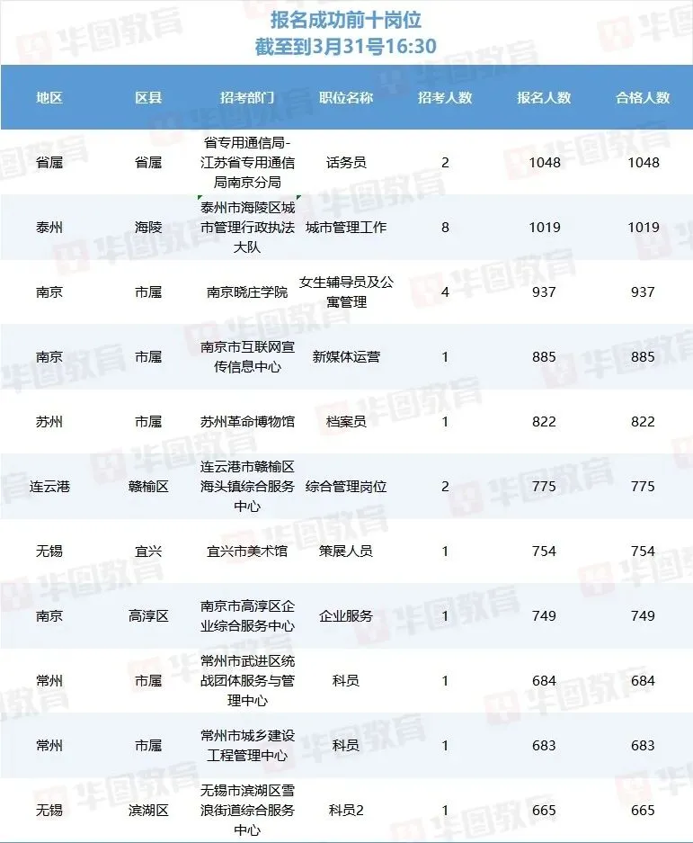 报名已结束,报名成功人数已确定,前十岗位中,省属、泰州、南京、苏州、无锡、常州、连云港的岗位占据榜单: