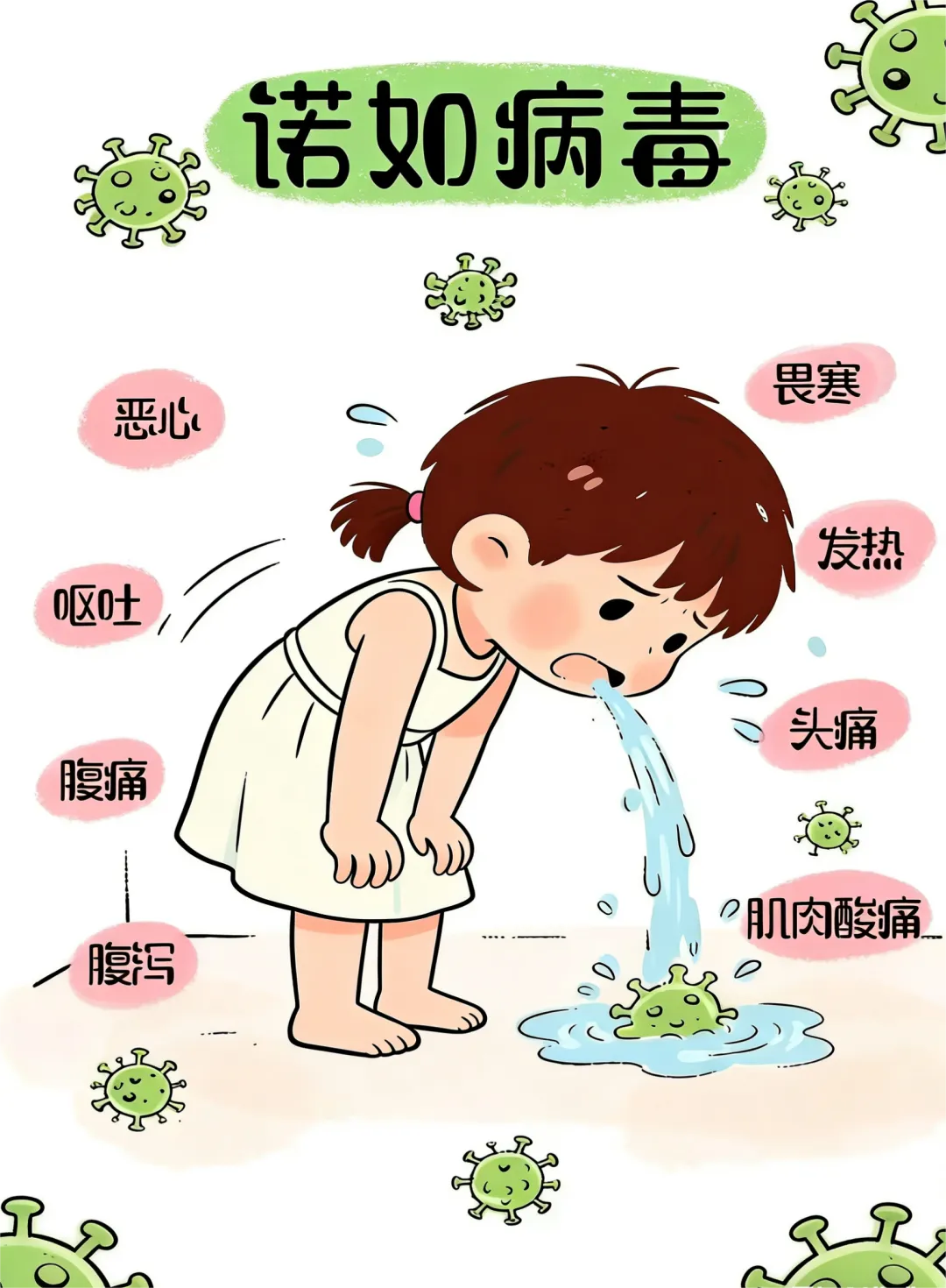 诺如病毒感染以呕吐和腹泻为主,其次为恶心、腹痛、头痛、轻度发热、畏寒和肌肉酸痛等。该病潜伏期一般为1~2天,多数患者症状轻微,通常在1~3天内可自行恢复;婴幼儿、老年人和免疫功能低下者恢复较慢,少数病例可能会发展为重症。