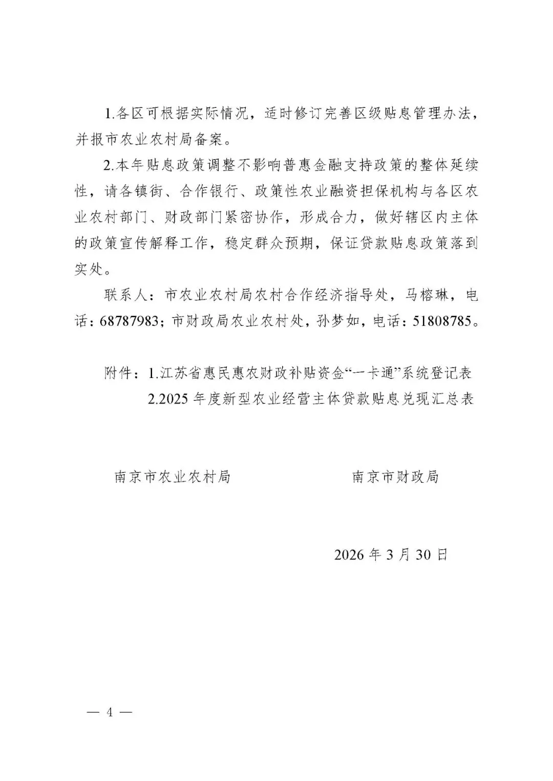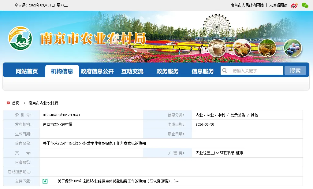 为推动政策性惠农贷款扩面增量,切实降低新型农业经营主体融资成本,市农业农村局、市财政局依据有关文件要求,形成了《关于做好2026年新型农业经营主体贷款贴息工作的通知》(征求意见稿)(详见附件),现向社会公开征求意见。如有意见请于2026年4月3日(周五)下午17:00前,将意见反馈至我局。