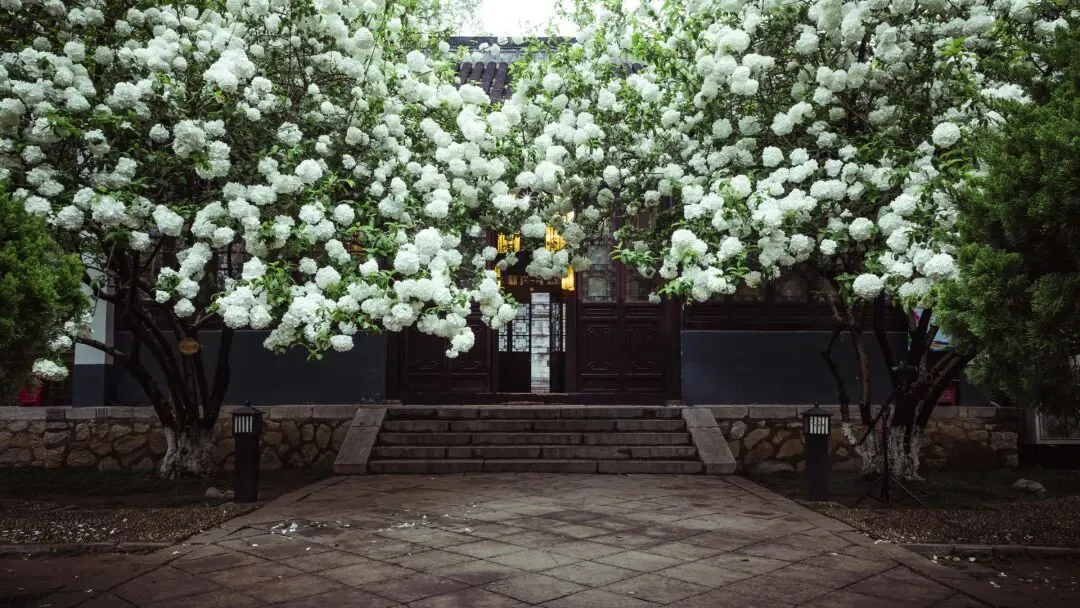 窗边绣球绝了!古风屋檐下爆开大片白色木绣球花瀑,随手一拍都是剧照即视感。