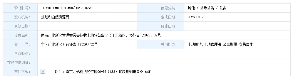 根据《中华人民共和国土地管理法》《中华人民共和国土地管理法实施条例》《江苏省土地管理条例》《市政府关于印发南京市集体土地征收补偿安置办法的通知》(宁政规字〔2022〕4号)有关规定,因公共利益需要,经南京江北新区管理委员会决定,启动南京北站枢纽经济区06-39(A53)地块项目土地征收工作。现将有关情况公告如下: