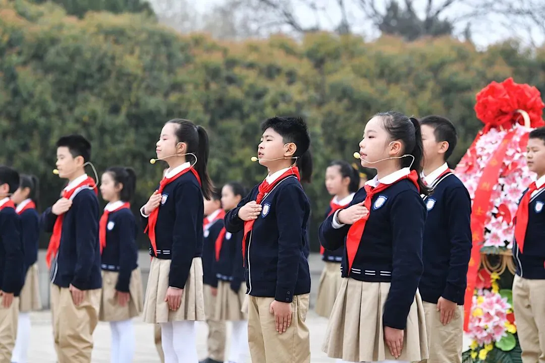 初春的雨花台烈士纪念碑广场松柏苍翠、丰碑屹立,伴随着铿锵的《出旗曲》,庄严肃穆的祭英烈仪式拉开帷幕。鲜艳的“英雄中队”队旗迎风招展,《我们是共产主义接班人》歌声响彻广场,“红领巾讲解员”动情宣讲雨花英烈事迹,全体队员重温入队誓词、庄严呼号“时刻准备着!”,献上鲜花瞻仰雨花台烈士纪念碑,无不彰显着新时代少年赓续红色血脉的坚定信念。“雨花英烈啊!您的信仰,有我们传承发扬;您的牺牲,我们永远不会遗忘!我们,是你们生命的朗读者!我们,是这段历史的传颂者!”情景诗朗诵《我是你的朗读者》将活动推向高潮。