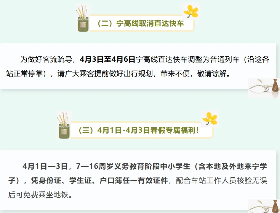 2026年4月1日-4月3日期间,7-16周岁中小学生可凭学生证或身份证免费乘坐南京公交、有轨电车及轮渡。