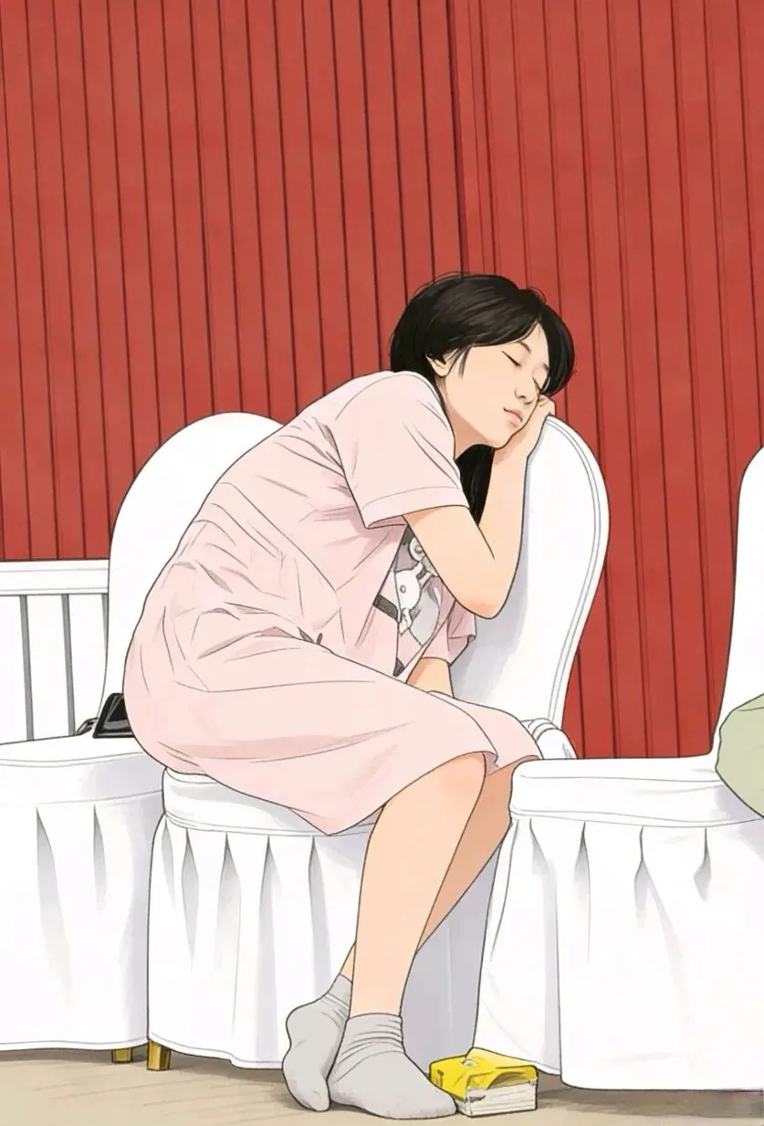还有侧着睡的。整个人斜斜往椅背上一靠,肩膀松松垮垮地塌着,上半身几乎要躺倒过去,一只手垫在脸颊和椅背之间,头就那么歪靠着,仿佛周遭的说话声、走动声全都被这层困倦的睡意隔在很远的地方。腿也随意地搭着,脚尖轻轻点地,却不着力,整个人就这么悬在清醒与沉睡之间。