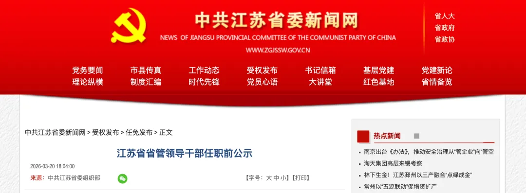 2026年3月20日,中共江苏省委组织部发布省管领导干部任职前公示,黄和拟任本科院校正职。