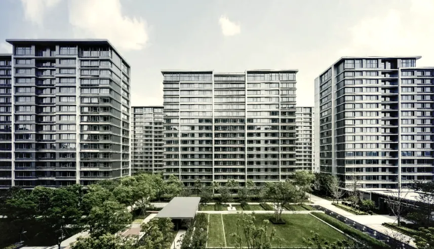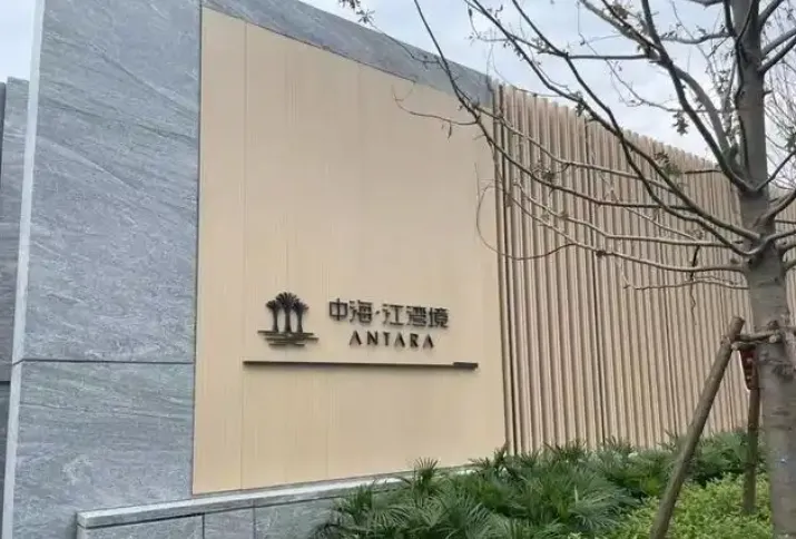 最引人注目的当属立面革新。中海江湾境创新打造南京首个木纹铝板立面,这在以玻璃幕墙和金属铝板为主流的南京豪宅市场中独树一帜。木纹铝板既保留了金属材料的耐久性和质感,又通过仿木纹理的设计,与江心洲的自然生态形成呼应,呈现出温润、雅致的视觉效果。配合斜切角屋檐和银白色线条,整个建筑立面既有现代感,又不失人文温度。
