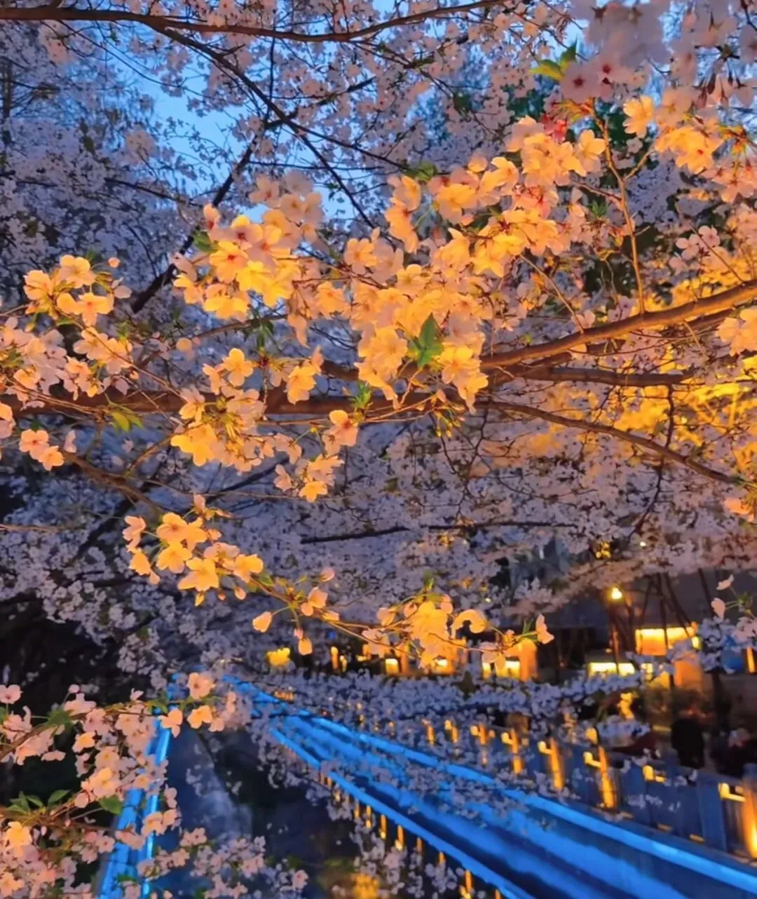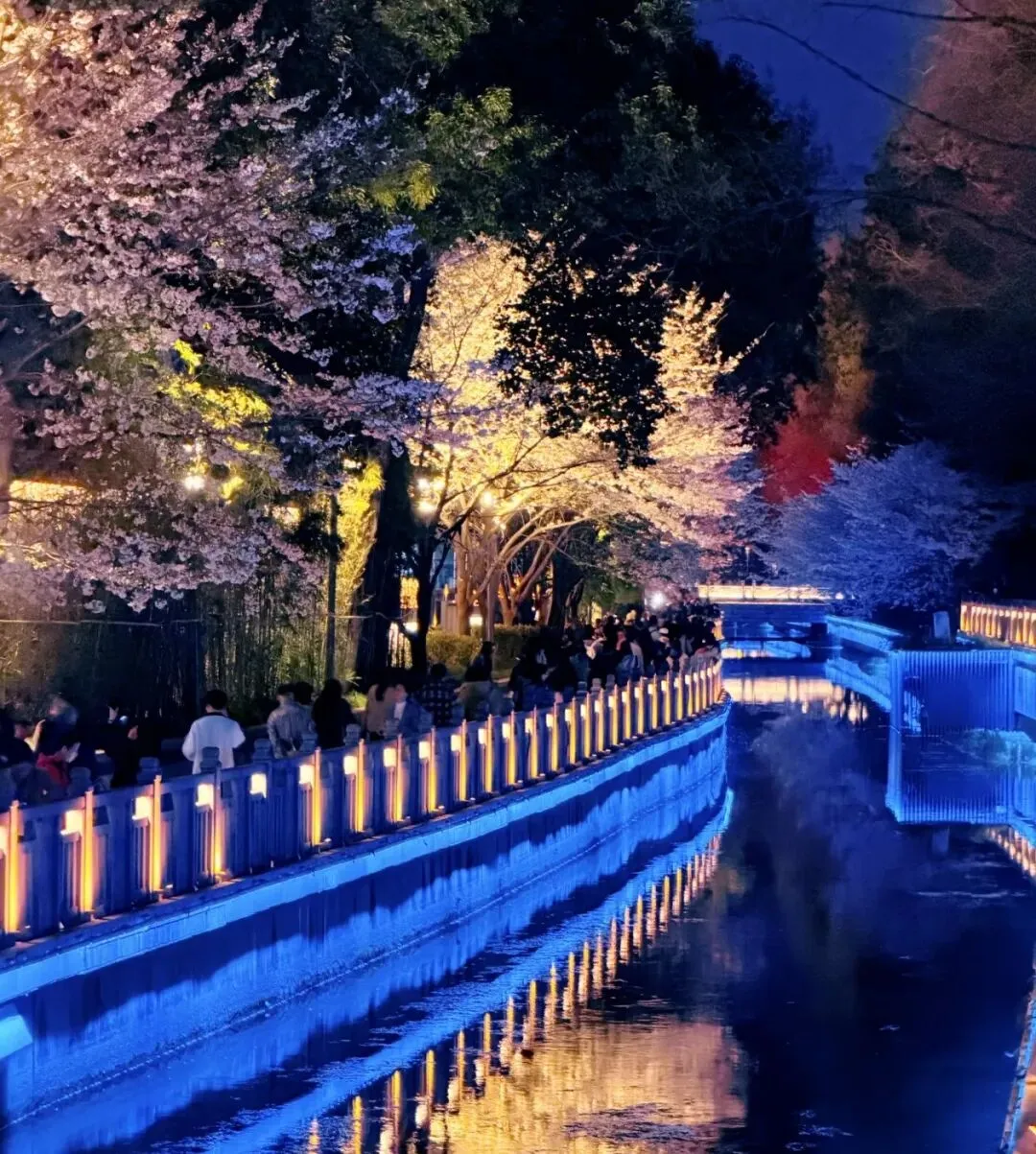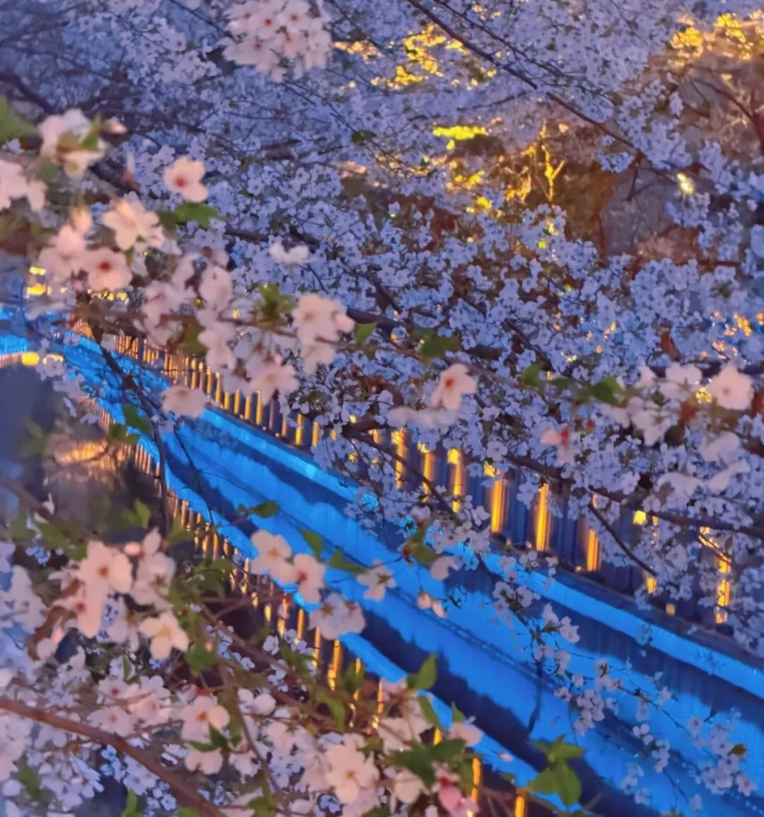 樱花、河水、灯光交织在一起,