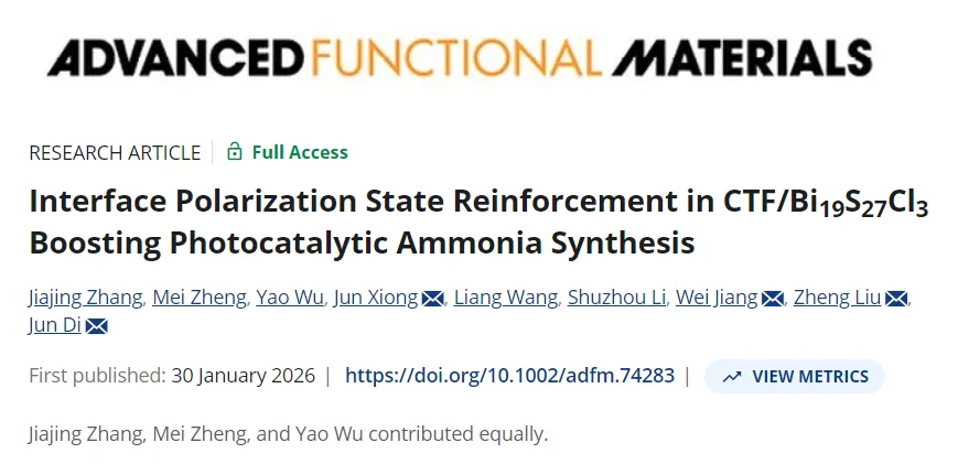 南京理工大学狄俊/姜炜&南洋理工大学刘政&江苏大学熊君最新AFM:强化CTF/Bi₁₉S₂₇Cl₃界面极化态以促进光催化合成氨!