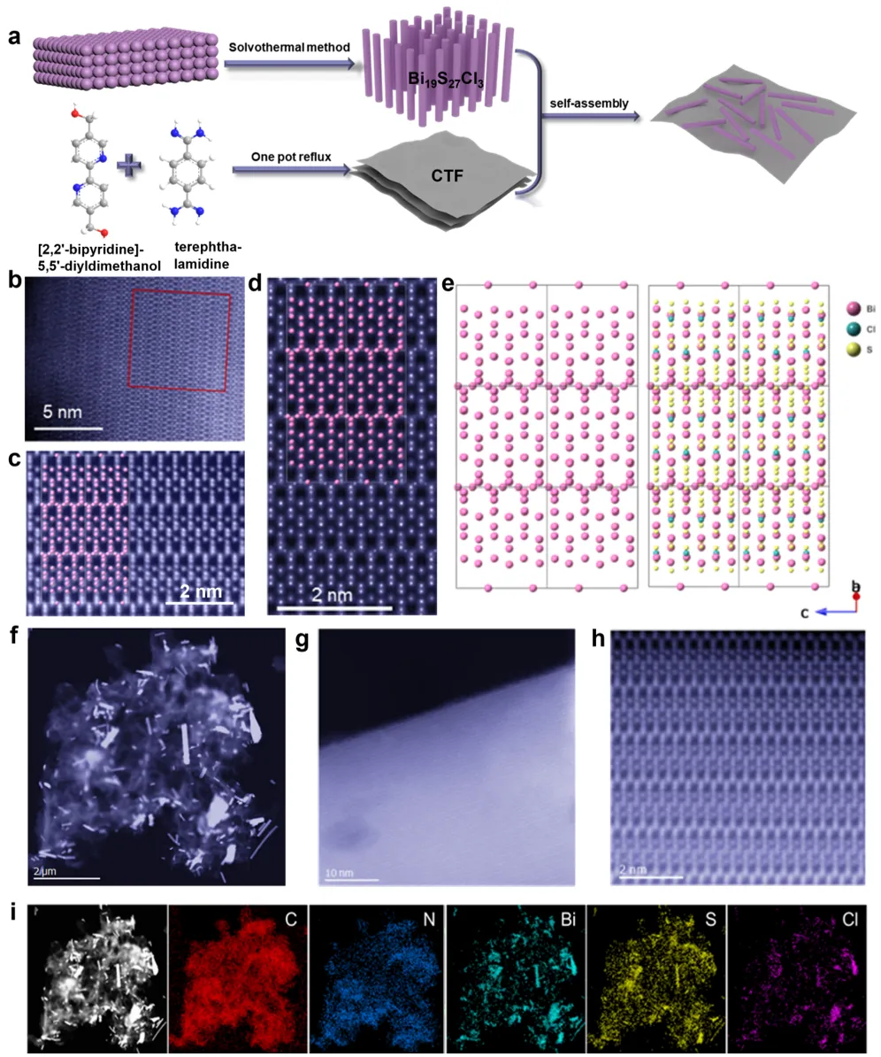 图1:CTF/Bi₁₉S₂₇Cl₃复合材料的结构表征:(a) CTF/Bi₁₉S₂₇Cl₃形成过程示意图展示超声辅助静电自组装策略合成CTF/Bi₁₉S₂₇Cl₃的步骤,包括CTF与Bi₁₉S₂₇Cl₃纳米片的混合、界面Bi─C/N键的形成及复合材料的自组装过程;(b) Bi₁₉S₂₇Cl₃的HAADF-STEM图像高角度环形暗场扫描透射电镜图像显示Bi₁₉S₂₇Cl₃的层状结构及原子级分辨率的晶格条纹。(c) Bi₁₉S₂₇Cl₃的高倍率成像进一步放大显示Bi₁₉S₂₇Cl₃的局部原子排列,确认其晶体结构特征。(d, e) Bi₁₉S₂₇Cl₃的模拟结构图对应实验观测的晶体结构,提供理论模拟的Bi₁₉S₂₇Cl₃原子模型,验证实验与理论的匹配性。(f-h) CTF/Bi₁₉S₂₇Cl₃-2的HAADF-STEM图像显示复合材料中CTF与Bi₁₉S₂₇Cl₃的界面结合情况,证实异质结构的形成。(i) CTF/Bi₁₉S₂₇Cl₃-2的EDS元素映射能量色散X射线光谱元素分布图显示Bi、S、Cl、C、N元素在复合材料中的均匀分布,确认CTF与Bi₁₉S₂₇Cl₃的成功复合。