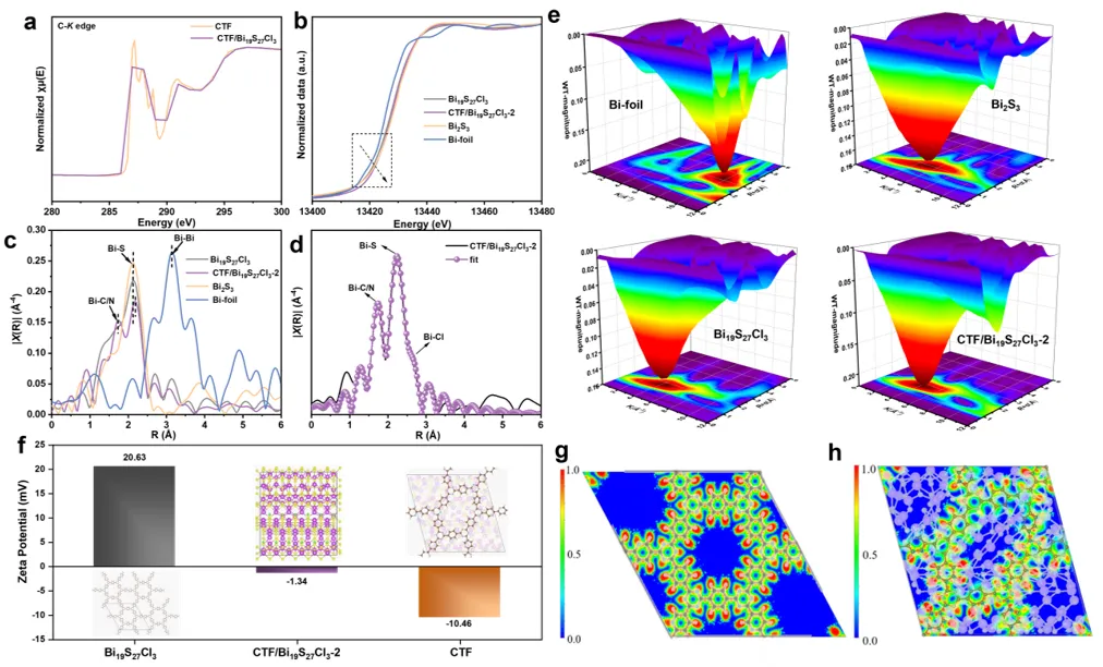 图2:CTF/Bi₁₉S₂₇Cl₃的电子结构与界面相互作用:(a) C K边XANES光谱比较CTF与CTF/Bi₁₉S₂₇Cl₃-2的碳K边吸收光谱,分析界面Bi─C键对碳电子结构的影响。(b) Bi L₃边XANES光谱显示Bi₁₉S₂₇Cl₃与CTF/Bi₁₉S₂₇Cl₃-2中铋的氧化态及局部配位环境变化。(c) 对应R空间傅里叶变换结果扩展X射线吸收精细结构(EXAFS)分析揭示Bi─C/N键的形成及键长信息。(d) CTF/Bi₁₉S₂₇Cl₃-2的R空间拟合定量分析界面Bi─C/N键的配位数及键长,确认强化学键合。(e) WT-EXAFS小波变换图进一步验证Bi─C/N键的存在,排除噪声干扰。(f) Zeta电位显示CTF、Bi₁₉S₂₇Cl₃及CTF/Bi₁₉S₂₇Cl₃-2的表面电荷性质,解释静电自组装的驱动力。(g, h) 电子局域函数(ELF)比较CTF与CTF/Bi₁₉S₂₇Cl₃的电子分布,揭示界面电荷极化增强效应。