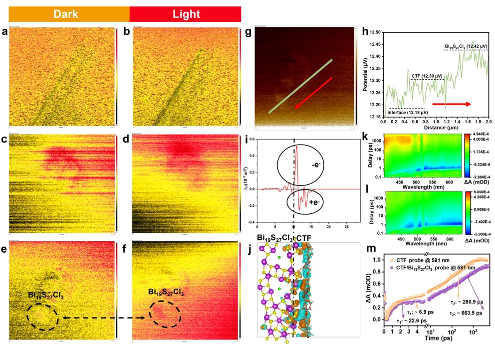 图3:CTF/Bi₁₉S₂₇Cl₃的表面电位与光生载流子动力学:(a, c, e) 暗态下表面电位分别显示Bi₁₉S₂₇Cl₃、CTF及CTF/Bi₁₉S₂₇Cl₃-2的表面电位分布,反映初始电荷状态。(b, d, f) 光照下表面电位光照后表面电位变化,证明光生载流子的分离与迁移。(g) 扫描开尔文探针力显微镜(KPFM)图像直观显示CTF/Bi₁₉S₂₇Cl₃-2的表面电位差异,确认界面电荷转移。(h) 接触电位差沿绿色线的变化定量分析界面电位梯度,支持电荷快速迁移的结论。(i, j) 界面能级排列图构建CTF/Bi₁₉S₂₇Cl₃-2的能带结构模型,解释光生载流子的转移路径。(k, l) 超快瞬态吸收(TA)光谱三维图比较CTF与CTF/Bi₁₉S₂₇Cl₃-2的载流子动力学,显示复合材料中载流子寿命延长。(m) 对应TA动力学曲线定量分析载流子衰减过程,证实界面工程对光催化性能的提升。