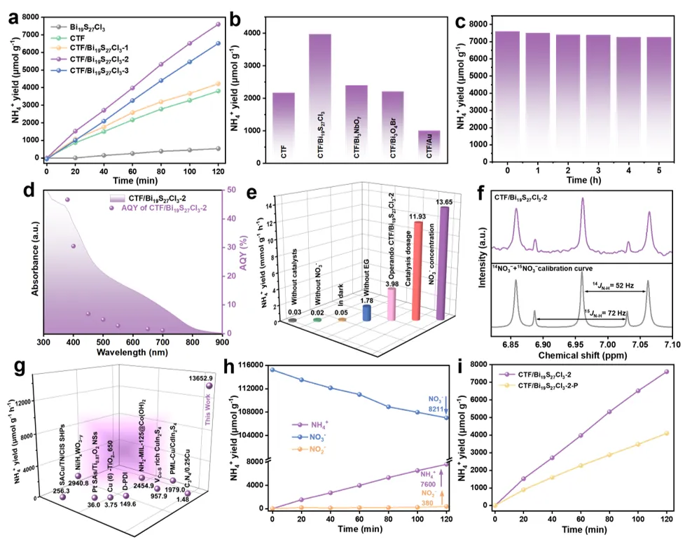 图4:CTF/Bi₁₉S₂₇Cl₃的光催化NO₃⁻还原性能:(a) 光催化NO₃⁻→NH₄⁺合成示意图展示光驱动硝酸根还原为铵根的反应路径及关键中间体。(b) 不同催化剂的NH₄⁺产率对比比较CTF、CTF/Bi₁₉S₂₇Cl₃、CTF/Bi₃NbO₇、CTF/Bi₃O₄Br及CTF/Au的活性,突出CTF/Bi₁₉S₂₇Cl₃的优势。(c) CTF/Bi₁₉S₂₇Cl₃-2的循环稳定性测试连续多次反应后活性保持率,证明催化剂的耐久性。(d) 不同单色光下的AQY显示CTF/Bi₁₉S₂₇Cl₃-2在380 nm、400 nm及700 nm处的表观量子产率,评估光谱响应范围。(e) 反应参数优化探究pH、催化剂用量等条件对NH₄⁺产率的影响,确定最佳反应条件。(f) ¹H NMR谱图使用¹⁵NO₃⁻与¹⁴NO₃⁻为氮源的还原产物核磁共振谱,确认NH₄⁺的生成。(g) 不同氨合成路径的产率对比比较光催化、电催化及热催化在常温常压下的NH₄⁺生产效率,突出光催化的优势。(h) 中间体检测原位红外光谱识别NO₃⁻还原过程中的关键中间体(如NO₂⁻、NO、NH₂OH)。(i) 磷掺杂对比实验比较CTF/Bi₁₉S₂₇Cl₃-2与磷掺杂样品(CTF/Bi₁₉S₂₇Cl₃-2-P)的活性,验证界面工程的关键作用。