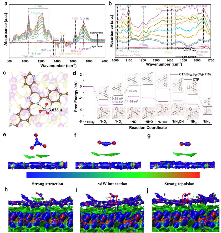 图5:NO₃⁻还原的机理研究(a, b) 原位FTIR光谱分别显示¹⁴NO₃⁻与¹⁵NO₃⁻在CTF/Bi₁₉S₂₇Cl₃-2上的还原过程,追踪中间体动态变化。(c) NO₃⁻吸附结构模型理论模拟NO₃⁻在CTF/Bi₁₉S₂₇Cl₃-2表面的吸附构型,揭示活性位点。(d) 吉布斯自由能图比较CTF与CTF/Bi₁₉S₂₇Cl₃-2上NO₃⁻还原为NH₄⁺的各步能垒,阐明界面工程降低决速步能垒的作用。(e-j) 独立梯度模型(IRI)等值面图分析NO₃、NO₂、*NO与CTF或CTF/Bi₁₉S₂₇Cl₃-2的相互作用强度:(e-g) CTF与中间体的弱相互作用(vdW力为主);(h-j) CTF/Bi₁₉S₂₇Cl₃-2与中间体的强化学键合(蓝色区域),证实界面强化稳定中间体的效果。颜色说明:IRI图中蓝色、绿色、红色分别代表强吸引(化学键)、弱吸引(vdW力)及排斥相互作用。