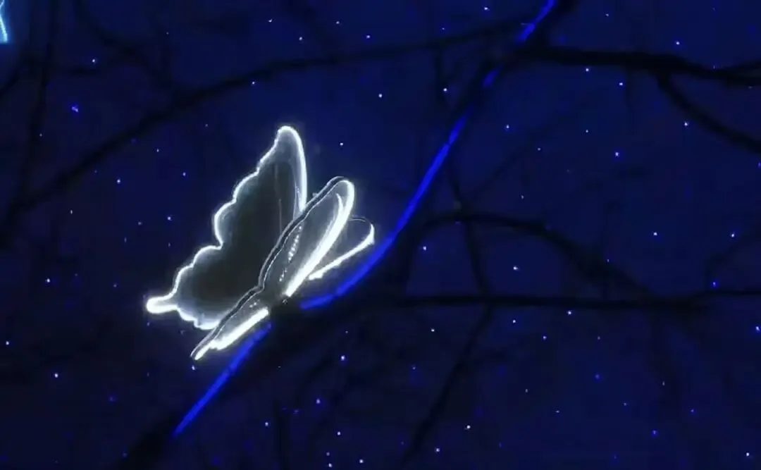 树枝间点缀的发光蝴蝶造型灯轻盈闪烁,与星点灯光相互呼应,构成“蝶舞星河”的梦幻场景。
