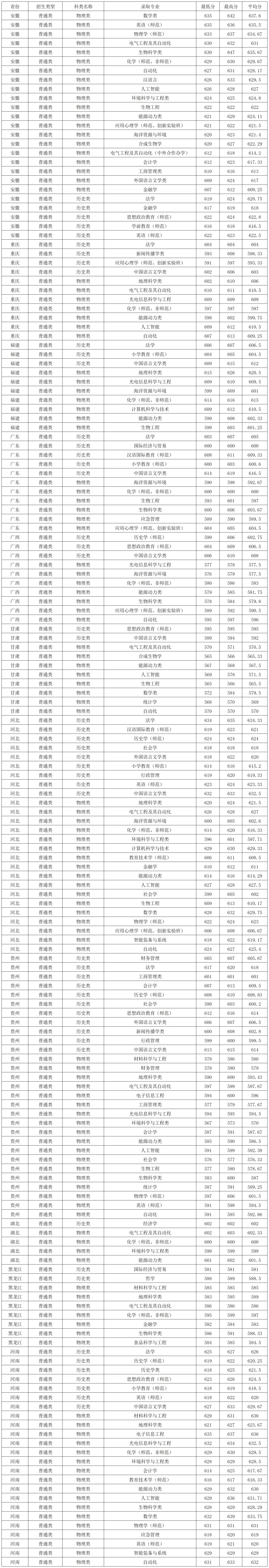 南京师范大学2025年在安徽本科批物理类录取分数线较高的专业 :数学类635分、英语(师范)635分、物理学(师范)633分、电气工程及其自动化630分、生物科学类630分,最低的是金融学607分。