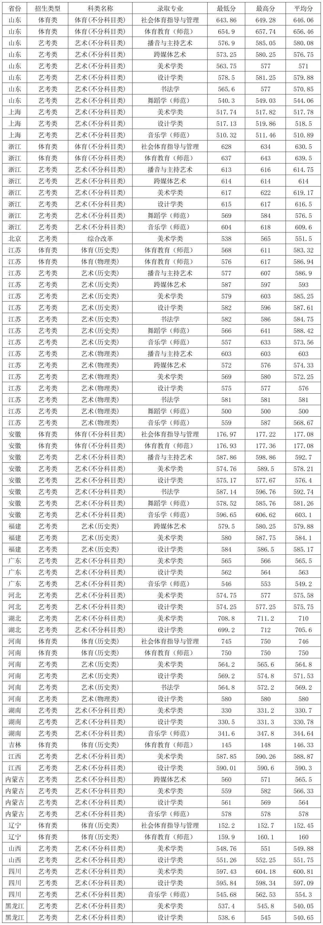 南京师范大学2025年艺术、体育类在各省各专业录取分数线