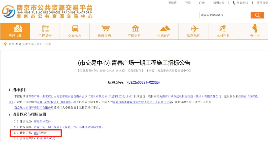 就在3月23日,“青春广场一期工程施工招标公告”发布,合同估算价4311万,计划工期199天。