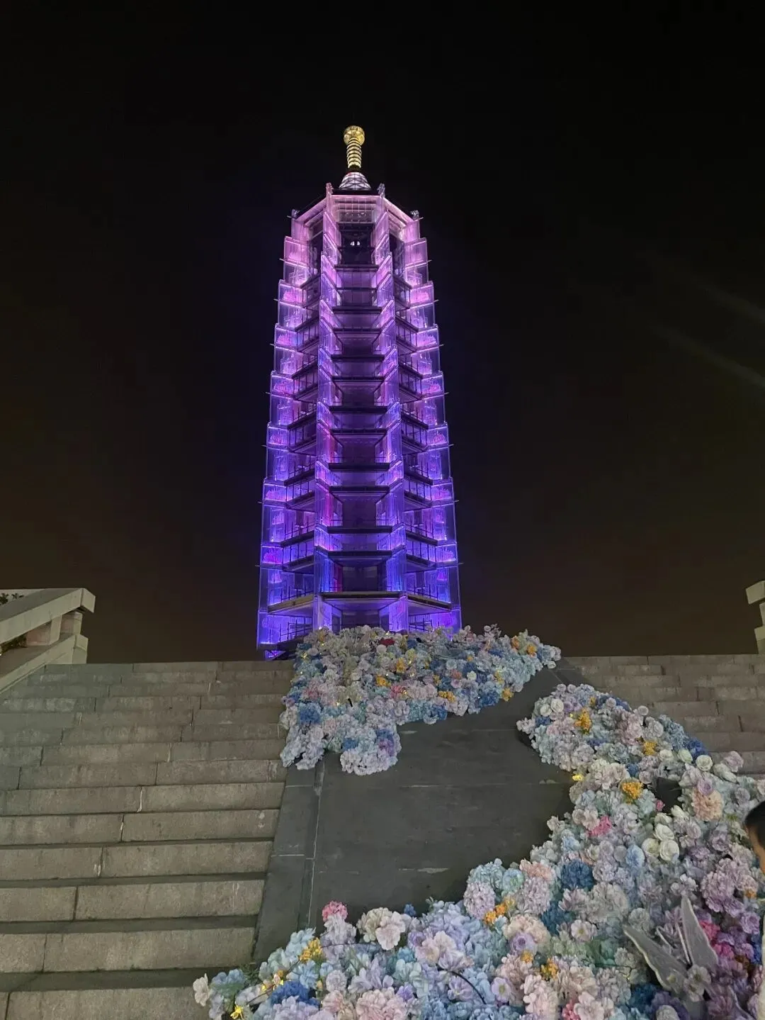那座琉璃塔在紫色的灯光映照下,呈现出一种通透而梦幻的质感。