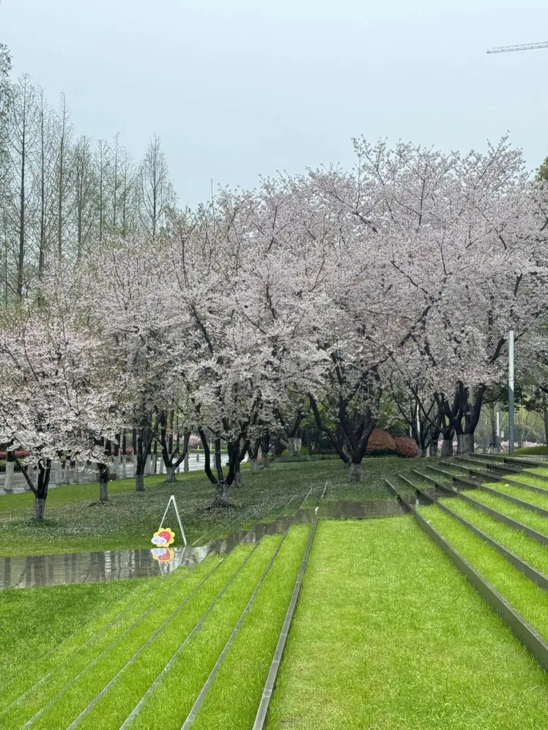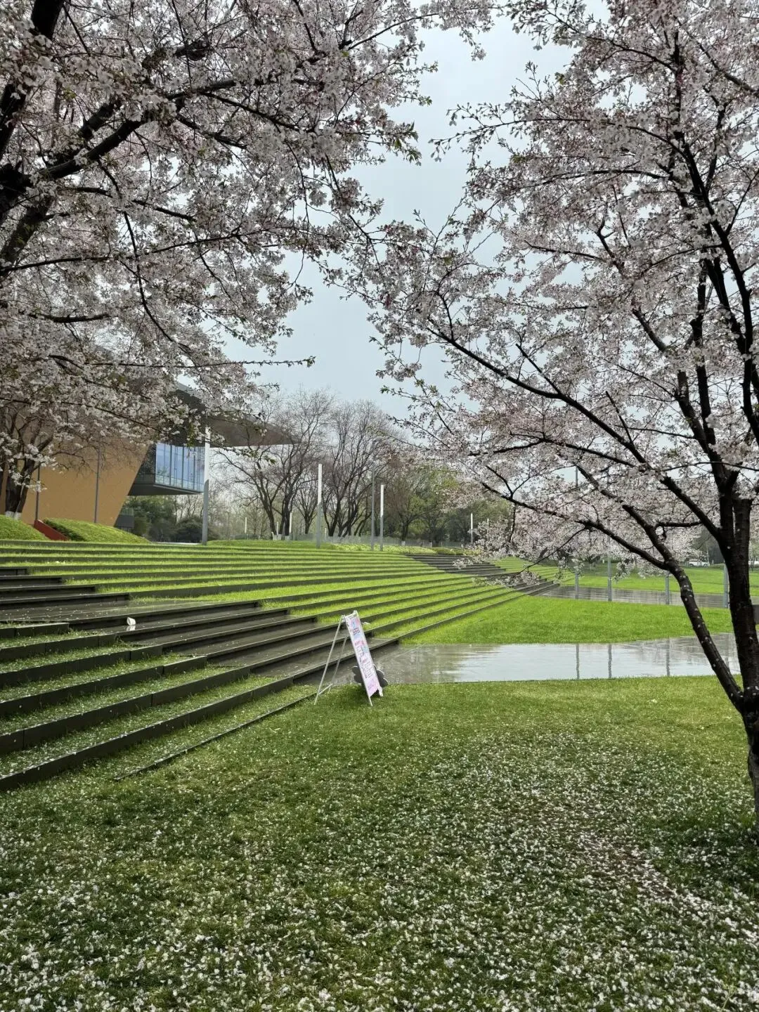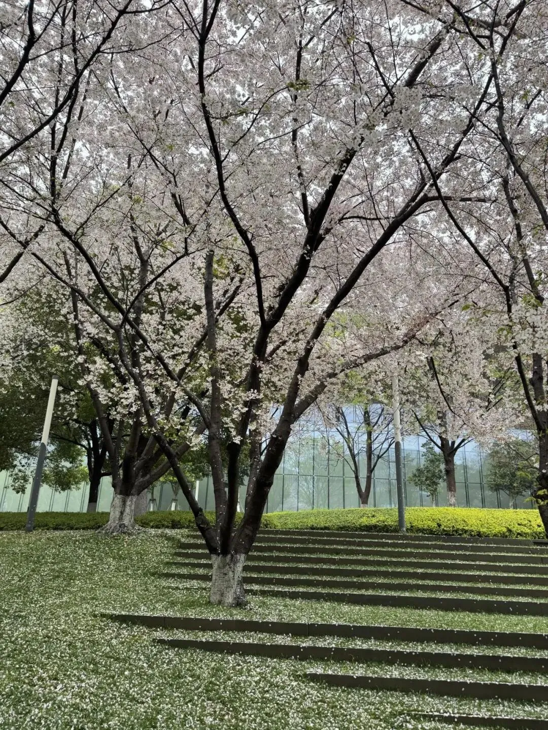 🌱这里的樱花主要集中在科创中心前的绿地,虽然面积不像公园那么庞大,但胜在静谧且有层次。成片的樱花树配上背后大片的草坪,视野超级开阔。江风一吹,花瓣像雪花一样飘落,落在你的肩头,落在草地上,那种“春日松弛感”瞬间就拉满了。