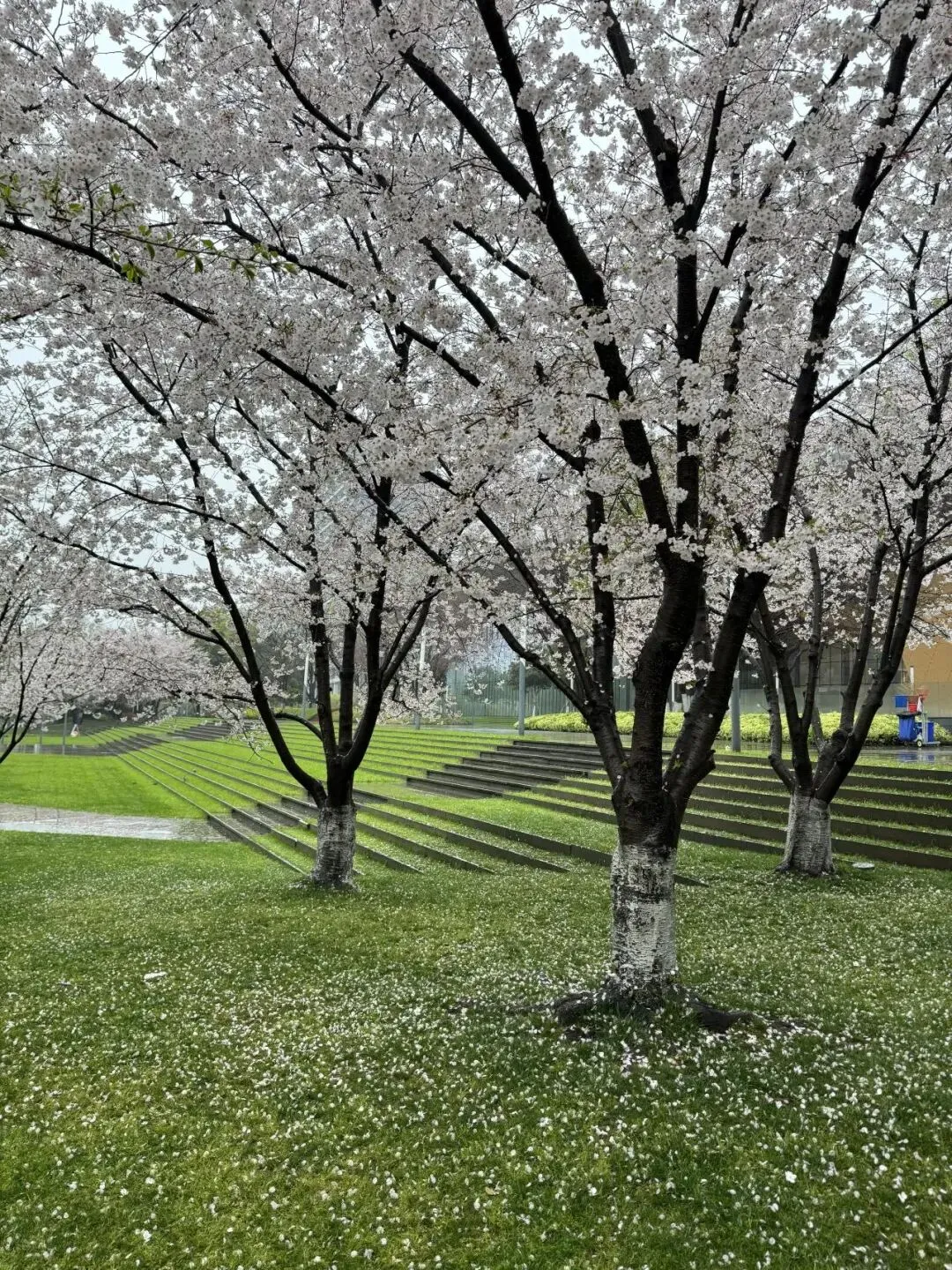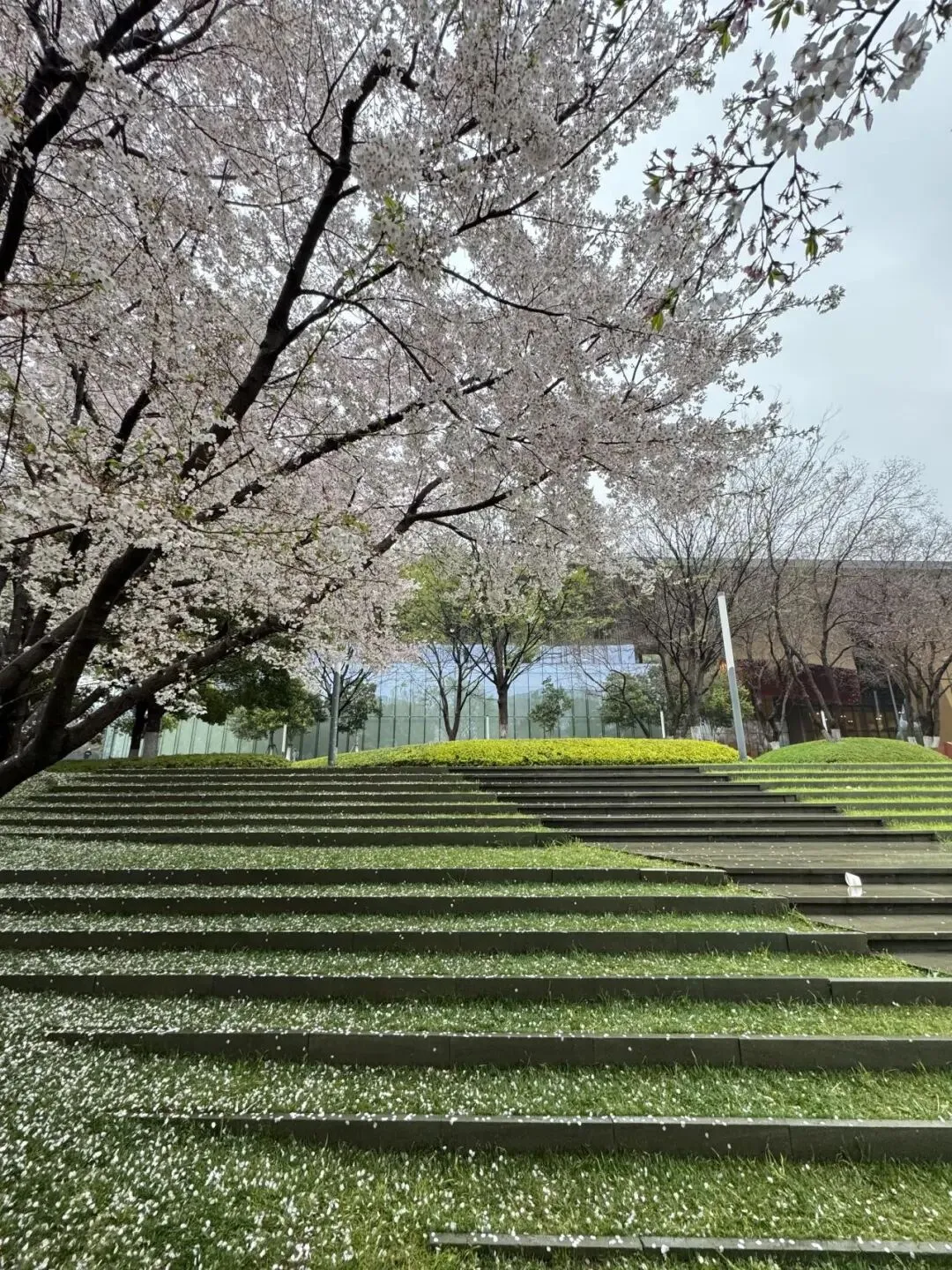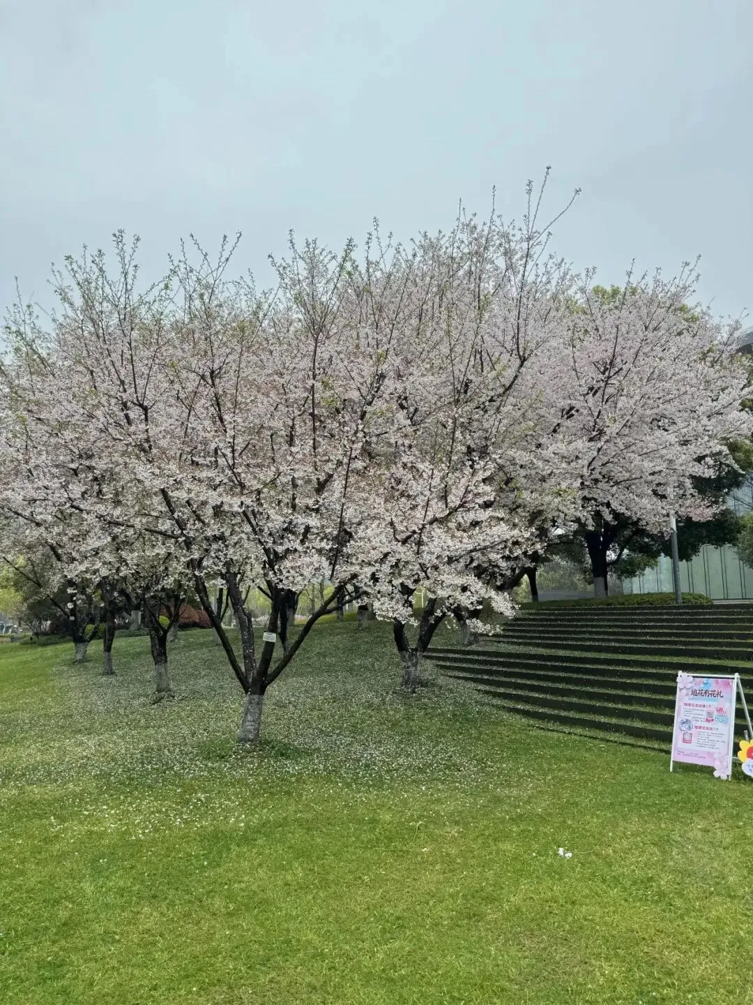 🌱这里的樱花主要集中在科创中心前的绿地,虽然面积不像公园那么庞大,但胜在静谧且有层次。成片的樱花树配上背后大片的草坪,视野超级开阔。江风一吹,花瓣像雪花一样飘落,落在你的肩头,落在草地上,那种“春日松弛感”瞬间就拉满了。