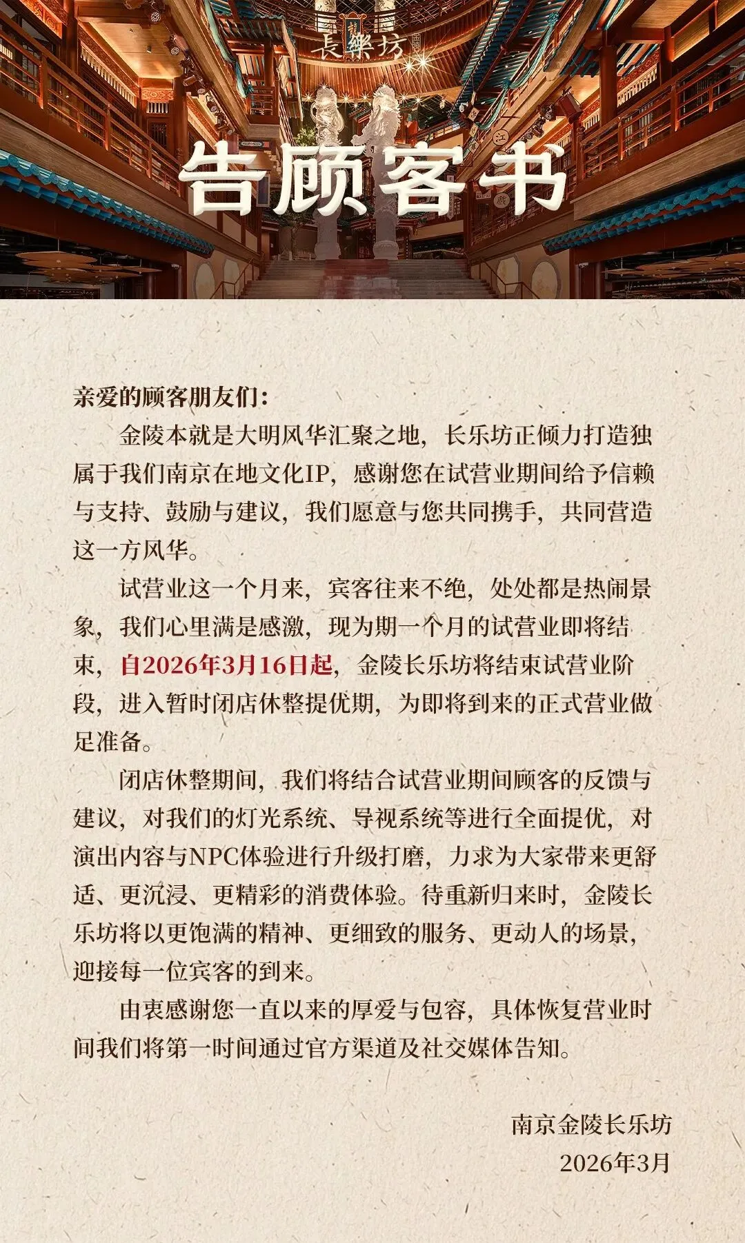 2026年3月16日,南京老城南核心区位的金陵长乐坊发布公告,宣布“自2026年3月16日起,金陵长乐坊将正式结束试营业阶段,进入闭店休整提优期”。