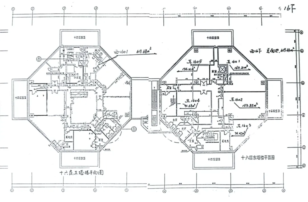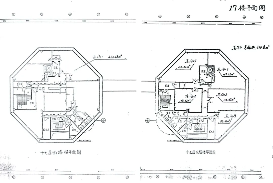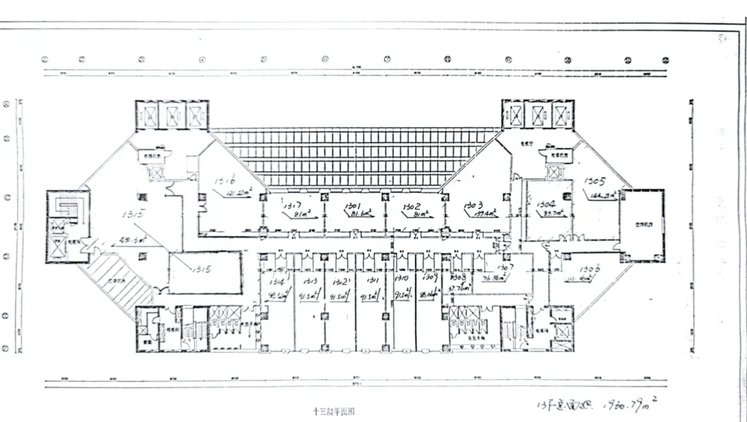 13楼整层,面积1960.79平米,分17本产证。客梯转换楼层,也是连接东西塔楼通道,需转内部电梯梯上到15-17楼。