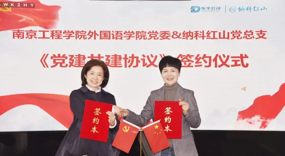纳科红山党总支书记周莉、南京工程学院外国语学院党委书记张相琼代表双方签订了党建共建协议。