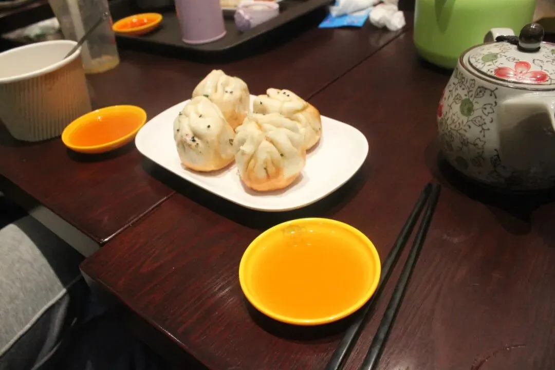 生煎皮薄肉嫩,蘸醋吃,酸鲜可口,一口咬下去,汁和肉充满了味蕾。