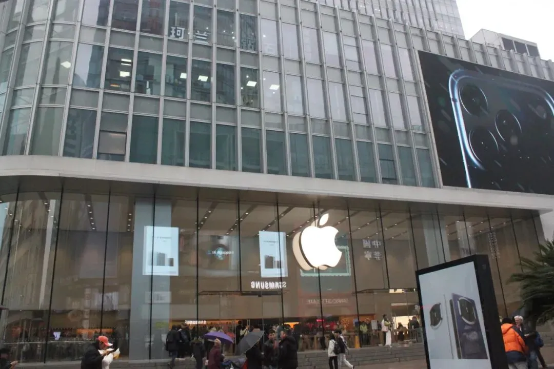 接着逛到的是我最期待的iPhone店,它和三星店正好面对面相对着。我们对比了一下这两家店。iPhone店很简洁,没有墙,全是玻璃,一楼二楼打通,走进去觉得非常的高。全是iphone17和pro和max,手机质感好,拍照好,还有耳机平板和电脑。