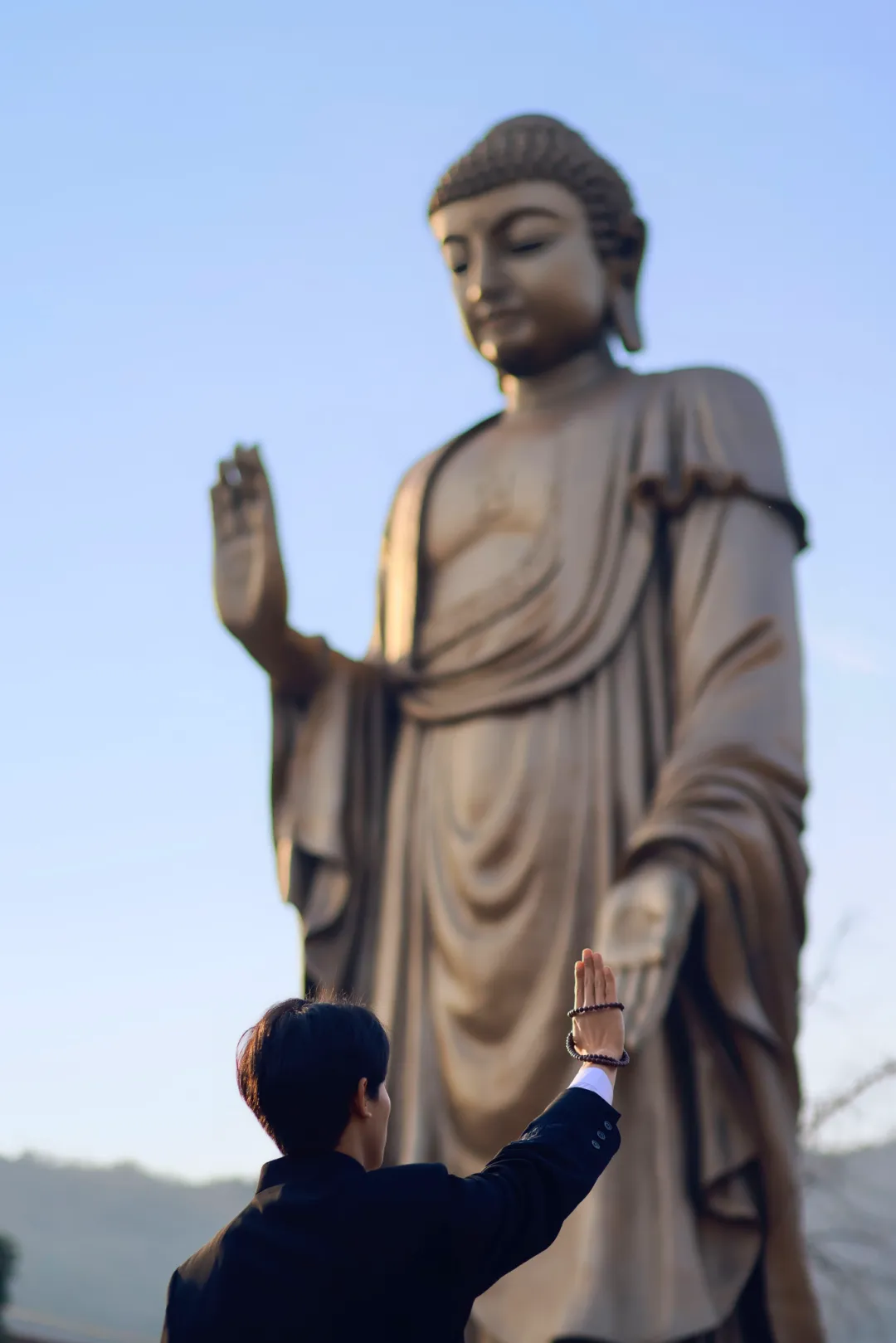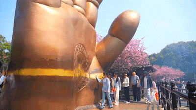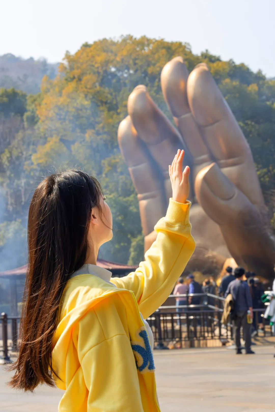 使用摄影视觉错位的方式拍摄“和大佛击掌”的照片,用独特的视觉效果,打造最特别的春日祈福照片。并肩踏春风,一起祈福,步履生花。
