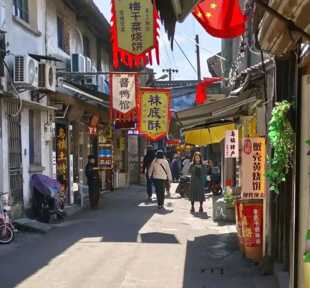 街两边,乌镇特产姑嫂饼、糕点之类、三白酒、蓝印花布店铺一家连一家,萝卜丝饼、青团子热气腾腾。