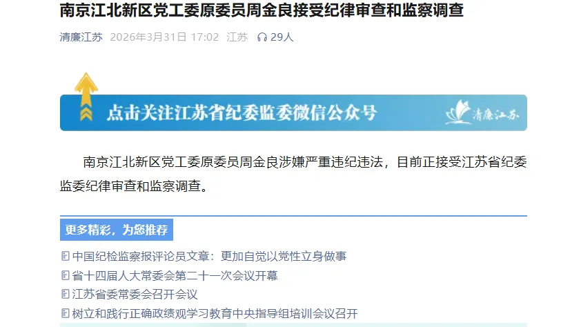 据清廉江苏官方微信号报道:南京江北新区党工委原委员周金良涉嫌严重违纪违法,目前正接受江苏省纪委监委纪律审查和监察调查。周金良,男,汉族,1962年7月生,江苏常州人,中共党员,拥有江苏省委党校研究生学历。