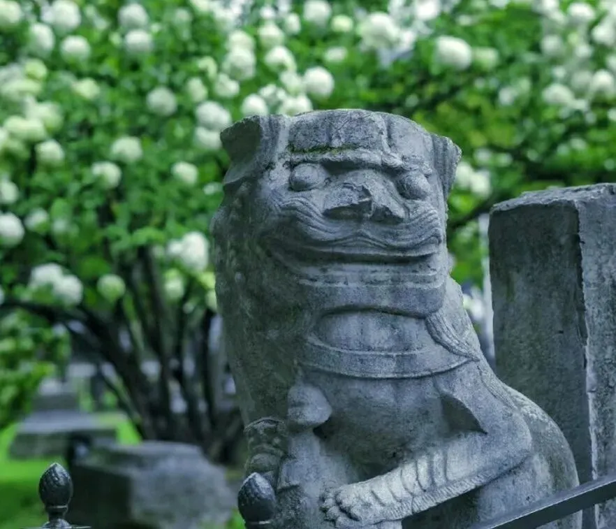 草坪上散落巨型石基,五爪龙、牡丹纹,是明初皇家工艺;汉白玉照壁雕双龙、双鹿、双狮等吉祥纹样;三对明初石狮,古朴威严,青黑色石材与木绣球的白绿色相得益彰。