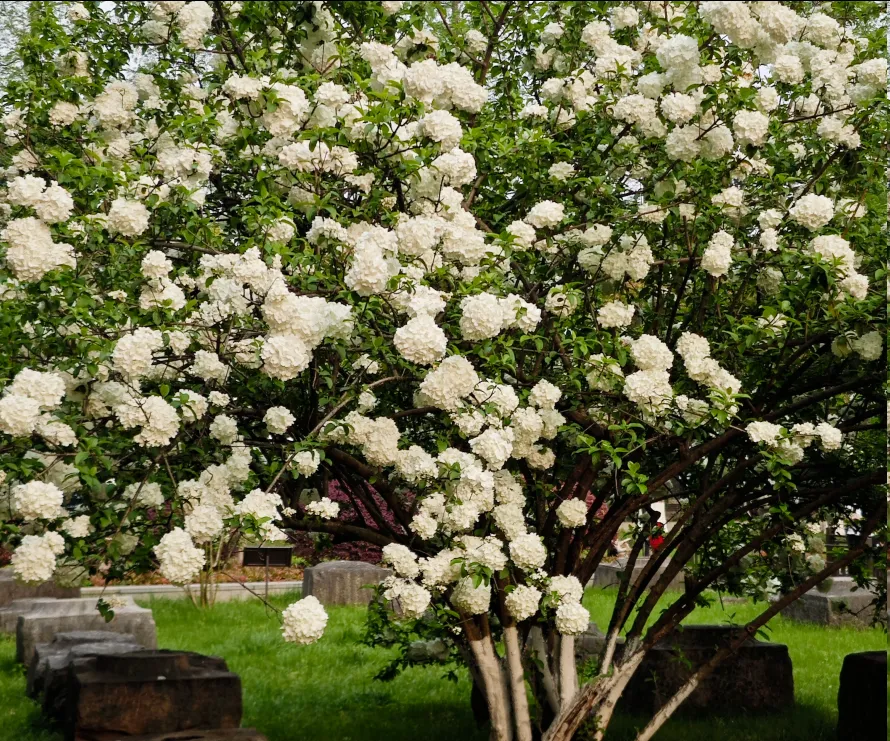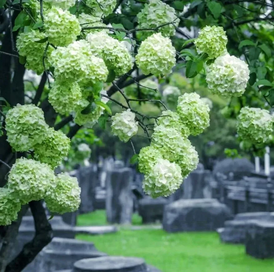 园内的木绣球植株数量多,株型高大,花球饱满硕大,成团成簇开满枝头。其中两株已经有四五十年的历史了。