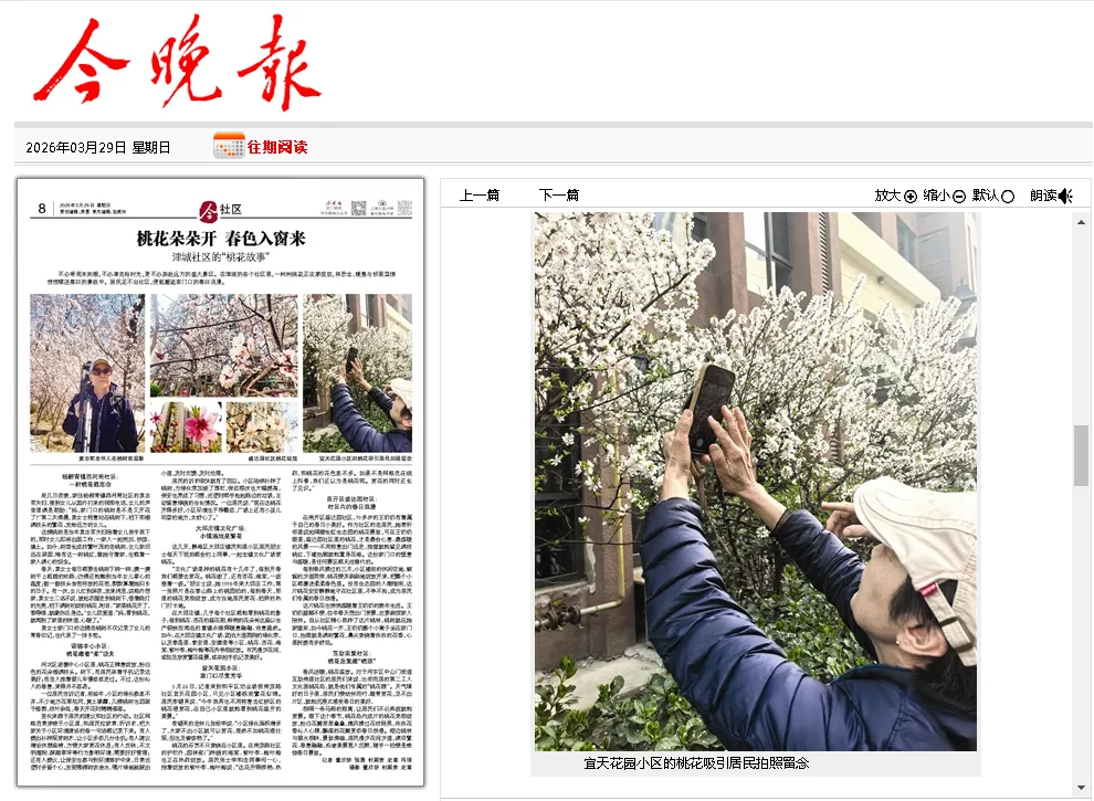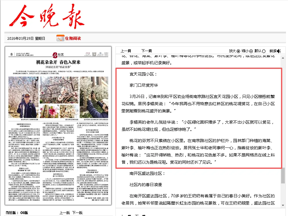 3月26日,记者来到和平区劝业场街南京路社区宜天花园小区,只见小区楼栋前繁花似锦。居民李锡英说:“今年我再也不用特意去红桥区的桃花堤赏花,在自己小区里就能看到桃花盛开的美景。”