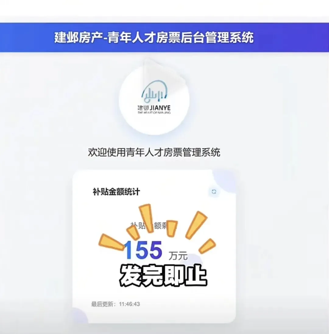 房票额度告急:据“建邺房产-青年人才房票后台管理系统”消息,建邺区本轮房票补贴2000万的资金额度,截至目前已经仅剩150多万了,额度非常紧张!可享受补贴的高知人才,正在河西各大新盘抓紧看房,以免错过补贴机会。