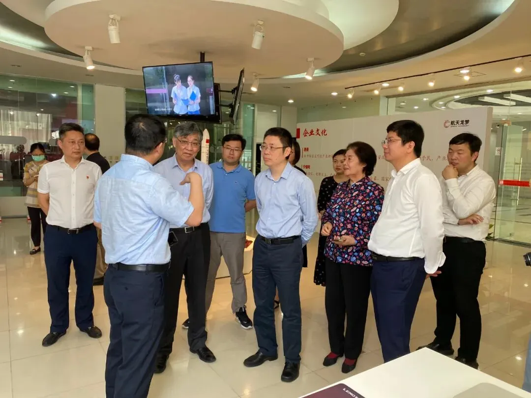 2020年7月1日上午,省科协副主席、南京大学祝世宁院士和南京大学陆延青副校长教授一行调研航天龙梦常熟总部,常熟市委副书记秦猛、市政府副市长吴庚昌等领导陪同。江苏梦兰集团公司董事长、航天龙梦名誉董事长钱月宝,航天龙梦管理层王剑秋、吴少刚陪同调研。