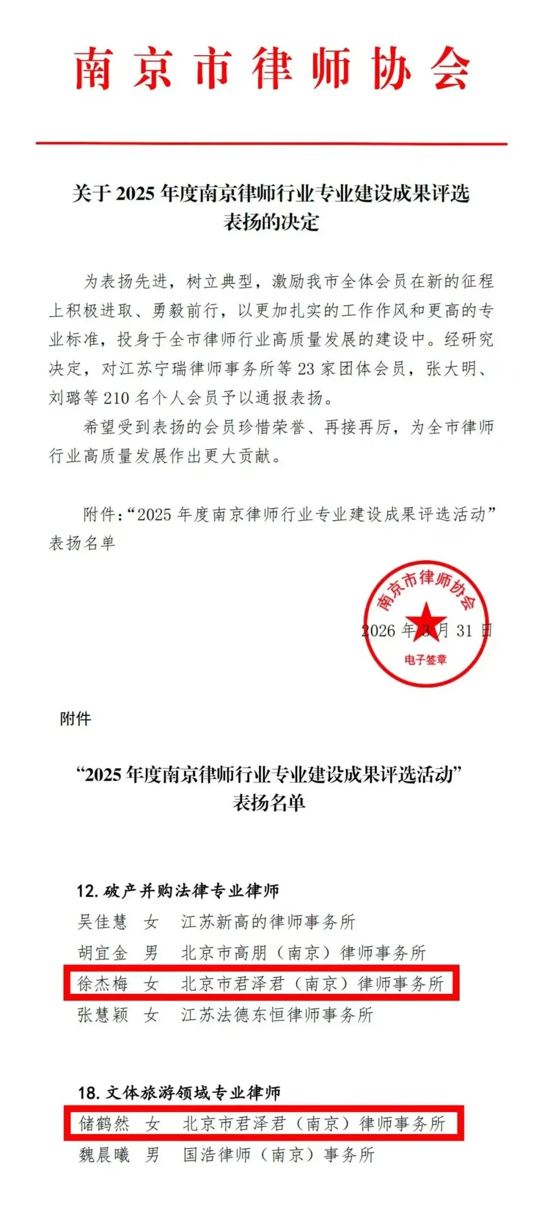 近日,为表扬先进,树立典型,激励会员积极进取,勇毅前行,南京市律师协会发布了“关于2025年度南京律师行业专业建设成果评选表扬的决定”,北京市君泽君(南京)律师事务所徐杰梅律师、储鹤然律师分别荣获“破产并购法律专业律师”“文体旅游领域专业律师”称号。