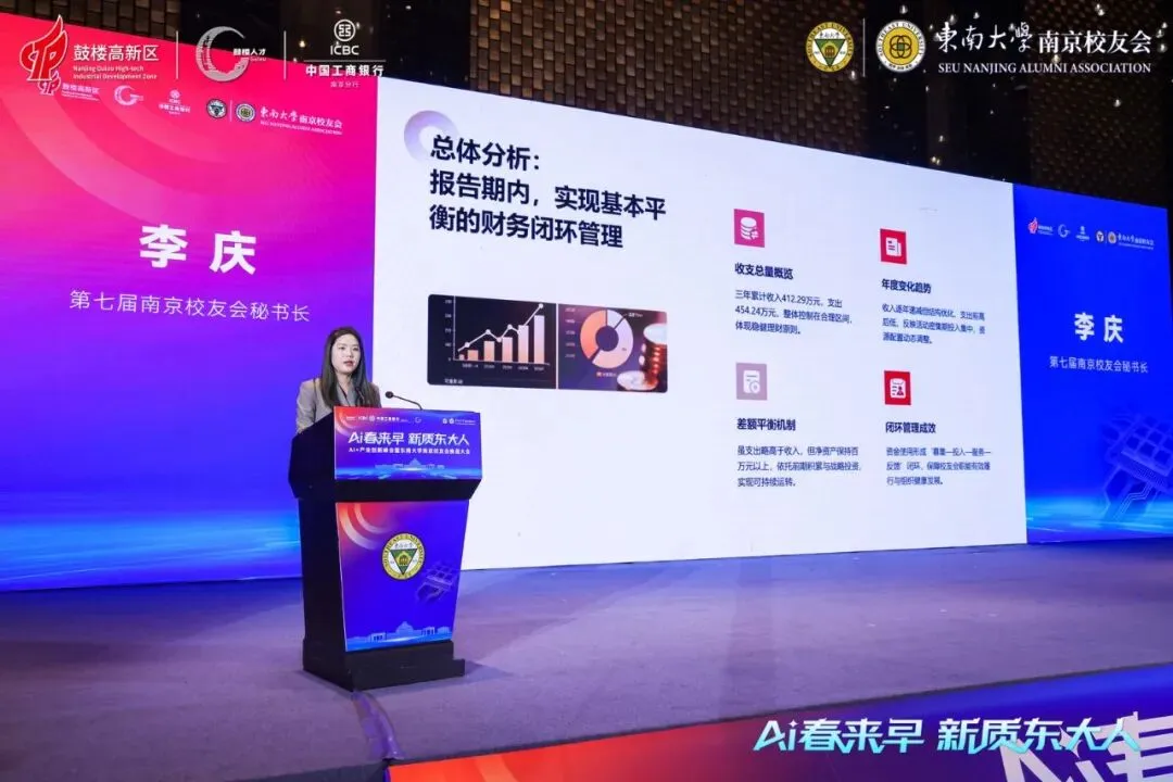 大会上,第七届南京校友会会长刘国耀代表理事会作工作报告,全面回顾三年发展成果。他指出,理事会始终秉持 “服务校友、服务母校、服务社会” 宗旨,推动校友会从 “情感共同体” 向 “价值共生平台” 跨越:三年新增链接校友超 2 万人,专职服务团队规模增长三倍;常态化举办 50 余场产学研交流活动,建成 10 个校友经济产业园,累计孵化校友企业 500 余家;打造 “发现东大独角兽大赛” 等核心品牌 IP,校友会直接回馈母校到账资金 150 万元,带动在宁校友企业累计回馈母校超 1 亿元。