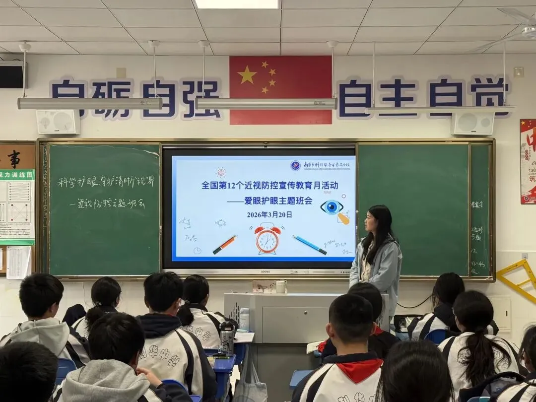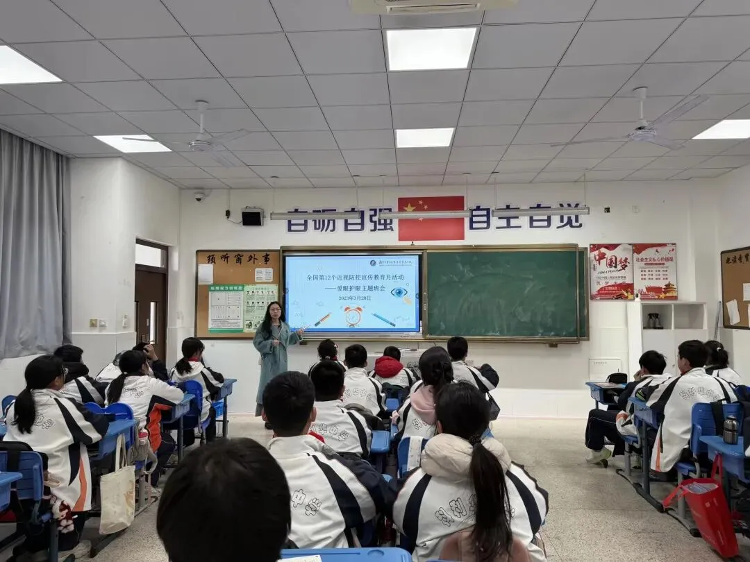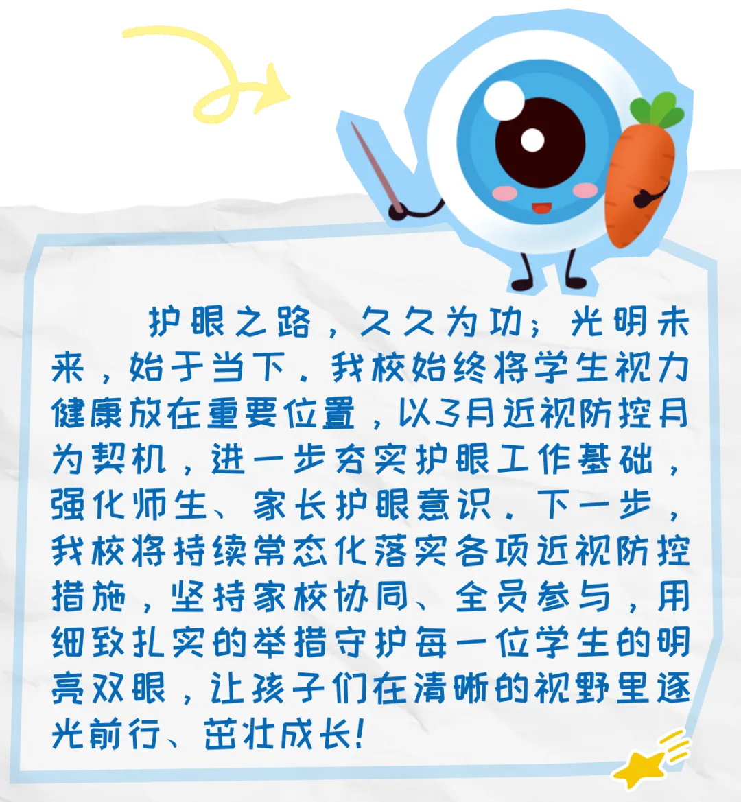 春暖花开,护眼正当时。3月是全国近视防控宣传教育月,呵护学生视力健康,是学校教育工作的重要使命,更是家校携手的共同责任。为深入贯彻落实青少年近视防控工作要求,筑牢学生视觉健康防护线,我校严格对照近视防控六项核心工作举措,逐项对标落实、精准发力推进,把护眼工作融入校园日常、落到细微之处,以实实在在的行动,守护每一位学子的明亮双眸,助力他们清晰看世界、健康向未来。