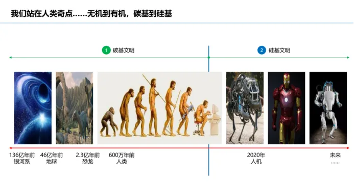 分享伊始,徐杨带我们回顾了人类文明的加速曲线。从无机到有机,从碳基到硅基,科技正以指数级推动社会进步。