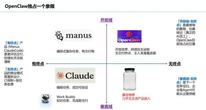 OpenClaw独占一个「开放域·无终点」的象限,同时「垂直域·无终点」是下一个竞争空白,企业级Agent将从这里突破,给有志创业的人员提供了前所未有的机会。