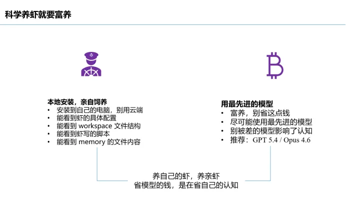 龙虾就像养孩子一样,富养你的龙虾。尽可能花钱购买最先进的模型,亲自在本地安装饲养,省模型的钱,是在省自己的认知。