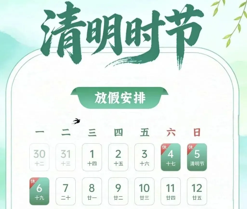 春光稍纵即逝,陪伴弥足珍贵。为了让小朋友们和家人度过一个安全、舒心、充实又有意义的假期,现将南京一校幼儿园清明节放假安排、假期温馨提示告知各位家长,感谢大家一直以来的配合与支持。