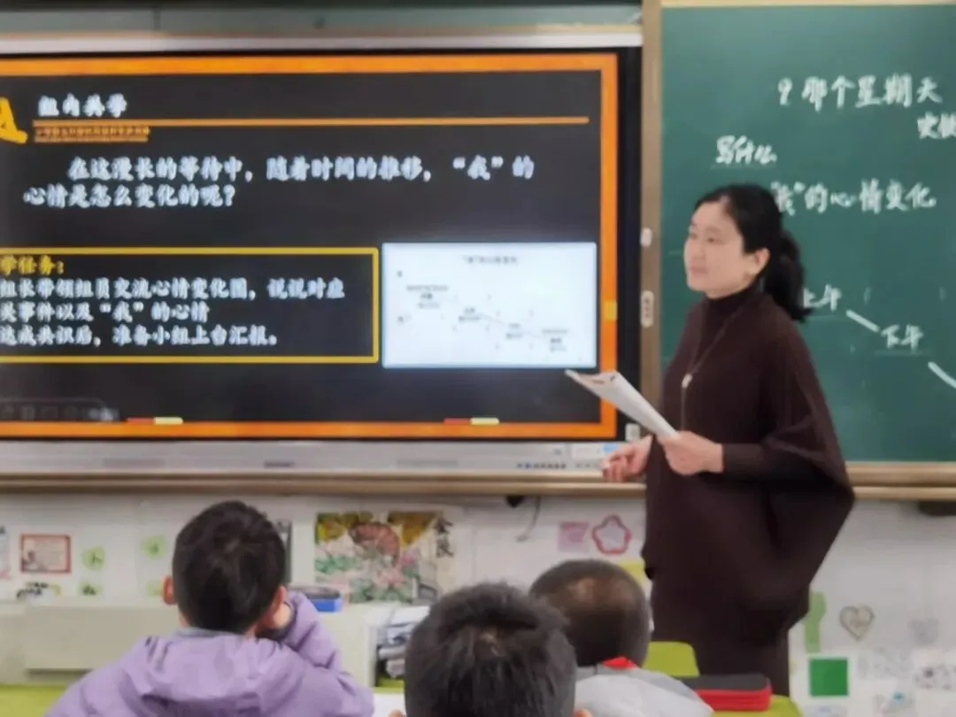 核心探究环节,高老师以“心情变化”为主线,设计小组共学任务:圈画事件、交流心情、完成心情变化图,让学生在合作中梳理“盼—急—落”的情感脉络。在学习第四、五自然段时,她聚焦“动作藏情”“标点传意”,引导学生对比“坐”与“蹲”的表达效果,探究省略提示语的写作妙处。学生们在思辨中倾听、在表达中质疑,主动将“融情于景、融情于事”的写法内化于心,课堂互动高效且富有生成性。